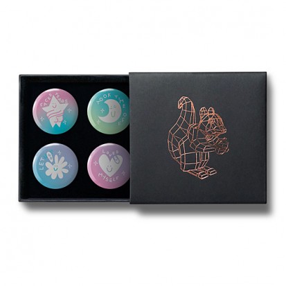 This elegant matchbox-style gift box contains four designs from Stereohype's growing button badge collection – now available for the first time in this superb packaging solution. A rose-gold foil-blocked Stereohype mascot squirrel was hand-printed in the UK at the top of the gift box (outside dimensions: 75 x 72 x 16mm). Inside the beautiful matt black cardboard gift box is a black flock pad and badges are directly pinned into it. All Stereohype button badges available at stereohype.com are classic high quality one inch (25mm) metal back badges with so-called D-pin (although it looks more like an 'e'). Tiny stickers at the back of each button badge mention the artist, release date, series number, etc. Badges are manufactured with love and care in the United Kingdom.