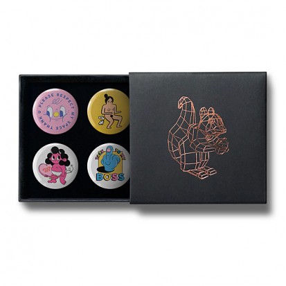This elegant matchbox-style gift box contains four designs from Stereohype's growing button badge collection – now available for the first time in this superb packaging solution. A rose-gold foil-blocked Stereohype mascot squirrel was hand-printed in the UK at the top of the gift box (outside dimensions: 75 x 72 x 16mm). Inside the beautiful matt black cardboard gift box is a black flock pad and badges are directly pinned into it. All Stereohype button badges available at stereohype.com are classic high quality one inch (25mm) metal back badges with so-called D-pin (although it looks more like an 'e'). Tiny stickers at the back of each button badge mention the artist, release date, series number, etc. Badges are manufactured with love and care in the United Kingdom.