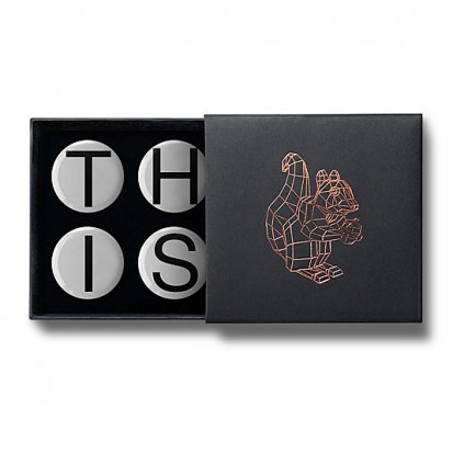 This elegant matchbox-style gift box contains four designs from Stereohype's growing button badge collection – now available for the first time in this superb packaging solution. A rose-gold foil-blocked Stereohype mascot squirrel was hand-printed in the UK at the top of the gift box (outside dimensions: 75 x 72 x 16mm). Inside the beautiful matt black cardboard gift box is a black flock pad and badges are directly pinned into it. All Stereohype button badges available at stereohype.com are classic high quality one inch (25mm) metal back badges with so-called D-pin (although it looks more like an 'e'). Tiny stickers at the back of each button badge mention the artist, release date, series number, etc. Badges are manufactured with love and care in the United Kingdom.