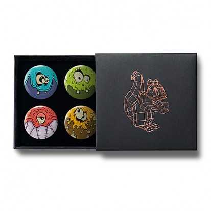This elegant matchbox-style gift box contains four designs from Stereohype's growing button badge collection – now available for the first time in this superb packaging solution. A rose-gold foil-blocked Stereohype mascot squirrel was hand-printed in the UK at the top of the gift box (outside dimensions: 75 x 72 x 16mm). Inside the beautiful matt black cardboard gift box is a black flock pad and badges are directly pinned into it. All Stereohype button badges available at stereohype.com are classic high quality one inch (25mm) metal back badges with so-called D-pin (although it looks more like an 'e'). Tiny stickers at the back of each button badge mention the artist, release date, series number, etc. Badges are manufactured with love and care in the United Kingdom.