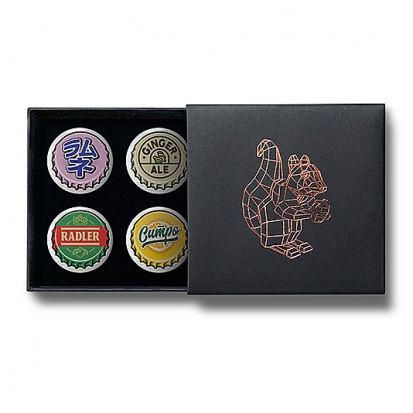 Maxim Morozov's crown cork bottle caps are design interpretations and do not display real brands. Similarities to existing drinks are possible. Ситро—Russian soda with pear flavour. Radler—A low-alcohol traditional and most popular German beer cocktail. ラムネ (Ramune)—A Japanese soda with the taste of lime and lemon. Ginger Ale—A sweet ginger-flavoured drink particularly popular in the United States.