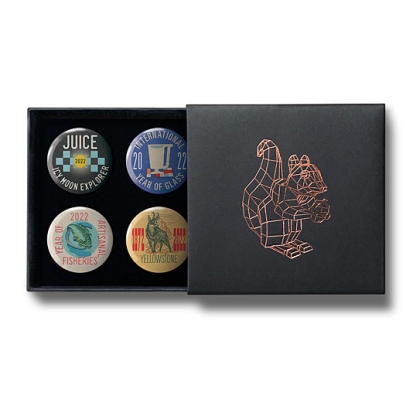 'I was inspired by vintage button badges and cigarette cards. I looked for 2022 anniversaries, and came up with the launch of JUICE – the Jupiter Icy Moons Explorer, The International Year Of Glass, The Year Of Artisanal Fisheries and the 150th anniversary of Yellowstone Park.' — Paul Pensom