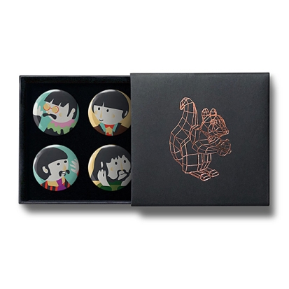 This elegant matchbox-style gift box contains four designs from Stereohype's growing button badge collection – now available for the first time in this superb packaging solution. A rose-gold foil-blocked Stereohype mascot squirrel was hand-printed in the UK at the top of the gift box (outside dimensions: 75 x 72 x 16mm). Inside the beautiful matt black cardboard gift box is a black flock pad and badges are directly pinned into it. All Stereohype button badges available at stereohype.com are classic high quality one inch (25mm) metal back badges with so-called D-pin (although it looks more like an 'e'). Tiny stickers at the back of each button badge mention the artist, release date, series number, etc. Badges are manufactured with love and care in the United Kingdom.