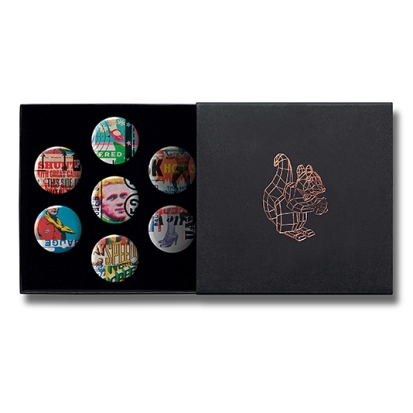 Seven button badges in new deluxe matchbox-style gift box (size M).
