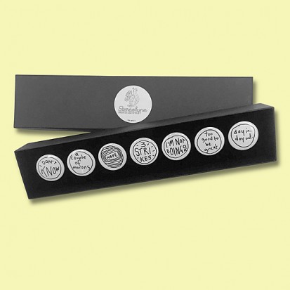 Each of these long luxury gift boxes contains seven of Stereohype's popular button badges. Selected designs are taken from Stereohype's growing button badge collection. So-called Artist Gift Boxes feature button badges designed by only one of Stereohype's super-talented 600+ international contributors – artists, illustrators, designers, architects, photographers, collectives and studios. Inside the elegant matt black cardboard gift box is a black flock pad and badges are directly pinned into it. All Stereohype button badges available at stereohype.com are classic high quality one inch (25mm) metal back badges with so-called D-pin (although it looks more like an 'e'). Tiny stickers at the back of each button badge mention the artist, release date, series number, etc. Badges are printed and encapsulated with love and care in the United Kingdom.