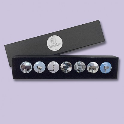 Each of these long luxury gift boxes contains seven of Stereohype's popular button badges. Selected designs are taken from Stereohype's growing button badge collection. So-called Artist Gift Boxes feature button badges designed by only one of Stereohype's super-talented 600+ international contributors – artists, illustrators, designers, architects, photographers, collectives and studios. Inside the elegant matt black cardboard gift box is a black flock pad and badges are directly pinned into it. All Stereohype button badges available at stereohype.com are classic high quality one inch (25mm) metal back badges with so-called D-pin (although it looks more like an 'e'). Tiny stickers at the back of each button badge mention the artist, release date, series number, etc. Badges are printed and encapsulated with love and care in the United Kingdom.