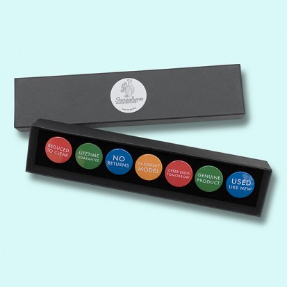 Each of these long luxury gift boxes contains seven of Stereohype's popular button badges. Selected designs are taken from Stereohype's growing button badge collection. So-called Artist Gift Boxes feature button badges designed by only one of Stereohype's super-talented 600+ international contributors – artists, illustrators, designers, architects, photographers, collectives and studios. Inside the elegant matt black cardboard gift box is a black flock pad and badges are directly pinned into it. All Stereohype button badges available at stereohype.com are classic high quality one inch (25mm) metal back badges with so-called D-pin (although it looks more like an 'e'). Tiny stickers at the back of each button badge mention the artist, release date, series number, etc. Badges are printed and encapsulated with love and care in the United Kingdom.