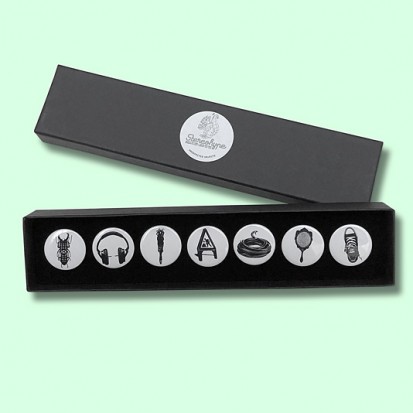 Each of these long luxury gift boxes contains seven of Stereohype's popular button badges. Selected designs are taken from Stereohype's growing button badge collection. So-called Artist Gift Boxes feature button badges designed by only one of Stereohype's super-talented 600+ international contributors – artists, illustrators, designers, architects, photographers, collectives and studios. Inside the elegant matt black cardboard gift box is a black flock pad and badges are directly pinned into it. All Stereohype button badges available at stereohype.com are classic high quality one inch (25mm) metal back badges with so-called D-pin (although it looks more like an 'e'). Tiny stickers at the back of each button badge mention the artist, release date, series number, etc. Badges are printed and encapsulated with love and care in the United Kingdom.