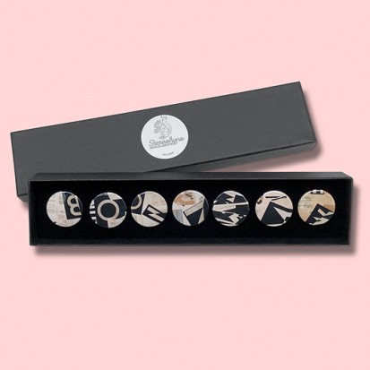 Each of these long luxury gift boxes contains seven of Stereohype's popular button badges. Selected designs are taken from Stereohype's growing button badge collection. So-called Artist Gift Boxes feature button badges designed by only one of Stereohype's super-talented 600+ international contributors – artists, illustrators, designers, architects, photographers, collectives and studios. Inside the elegant matt black cardboard gift box is a black flock pad and badges are directly pinned into it. All Stereohype button badges available at stereohype.com are classic high quality one inch (25mm) metal back badges with so-called D-pin (although it looks more like an 'e'). Tiny stickers at the back of each button badge mention the artist, release date, series number, etc. Badges are printed and encapsulated with love and care in the United Kingdom.