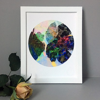 This artwork is from button badge gift box Leaves containing badges from B.I.O. (By Invitation Only) Button Badge Series 16. The design by FL@33's Agathe Jacquillat forms part of her expanding body of work – graphic art inspired by the subject of 'beautiful remains'. The slightly morbid yet colourful and joyful compositions are based on her personal photographs and scans of leaves. Other motifs in the 'beautiful remains' series include rotten fruit, rotten vegetables and deflated balloons. Artworks by FL@33's Agathe Jacquillat and/or Tomi Vollauschek are signed at the back.