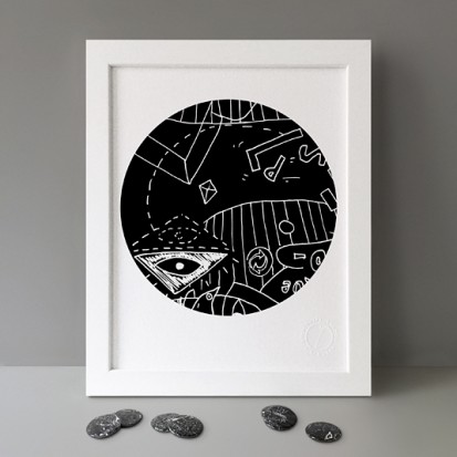 Button Badge Motif Print (STBBMP) — This carefully curated edition features designs from Stereohype's ever-growing one inch (25mm) button badge collection. The circular artworks are enlarged to seven inch (178mm) and printed on demand on a beautifully textured paper (portrait, 8 x 10" / 203 x 254mm). The print series already includes over 500 artworks and will further grow to be as rich and versatile as Stereohype's widely-acclaimed button badge collection. The badge collection already features over 1,700 artworks by over 600 established and emerging illustrators, graphic designers, typographers, photographers and artists from around the world. Some of Stereohype's button badge motifs are clearly better suited to be enlarged and featured on a print than others, but many hundreds of designs will make amazing print motifs. More prints are regularly added to this Stereohype range. Each print comes with the according button badge. We also have an optional custom frame for Button Badge Motif Prints (as seen in previews). This wooden high quality custom frame is built with a matt, white 'small alpha' frame made by our local London, Clerkenwell framer. Frames are also made on demand.