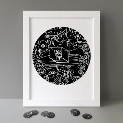 Button Badge Motif Print (STBBMP) — This carefully curated edition features designs from Stereohype's ever-growing one inch (25mm) button badge collection. The circular artworks are enlarged to seven inch (178mm) and printed on demand on a beautifully textured paper (portrait, 8 x 10" / 203 x 254mm). The print series already includes over 500 artworks and will further grow to be as rich and versatile as Stereohype's widely-acclaimed button badge collection. The badge collection already features over 1,700 artworks by over 600 established and emerging illustrators, graphic designers, typographers, photographers and artists from around the world. Some of Stereohype's button badge motifs are clearly better suited to be enlarged and featured on a print than others, but many hundreds of designs will make amazing print motifs. More prints are regularly added to this Stereohype range. Each print comes with the according button badge. We also have an optional custom frame for Button Badge Motif Prints (as seen in previews). This wooden high quality custom frame is built with a matt, white 'small alpha' frame made by our local London, Clerkenwell framer. Frames are also made on demand.