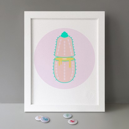 Button Badge Motif Print (STBBMP) — This carefully curated edition features designs from Stereohype's ever-growing one inch (25mm) button badge collection. The circular artworks are enlarged to seven inch (178mm) and printed on demand on a beautifully textured paper (portrait, 8 x 10" / 203 x 254mm). The print series already includes over 500 artworks and will further grow to be as rich and versatile as Stereohype's widely-acclaimed button badge collection. The badge collection already features over 1,700 artworks by over 600 established and emerging illustrators, graphic designers, typographers, photographers and artists from around the world. Some of Stereohype's button badge motifs are clearly better suited to be enlarged and featured on a print than others, but many hundreds of designs will make amazing print motifs. More prints are regularly added to this Stereohype range. Each print comes with the according button badge. We also have an optional custom frame for Button Badge Motif Prints (as seen in previews). This wooden high quality custom frame is built with a matt, white 'small alpha' frame made by our local London, Clerkenwell framer. Frames are also made on demand.