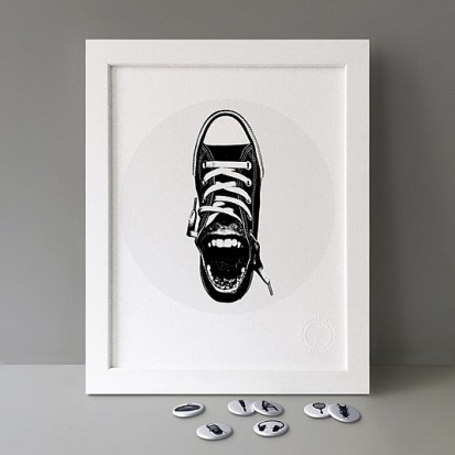 Button Badge Motif Print (STBBMP) — This carefully curated edition features designs from Stereohype's ever-growing one inch (25mm) button badge collection. The circular artworks are enlarged to seven inch (178mm) and printed on demand on a beautifully textured paper (portrait, 8 x 10" / 203 x 254mm). The print series already includes over 500 artworks and will further grow to be as rich and versatile as Stereohype's widely-acclaimed button badge collection. The badge collection already features over 1,700 artworks by over 600 established and emerging illustrators, graphic designers, typographers, photographers and artists from around the world. Some of Stereohype's button badge motifs are clearly better suited to be enlarged and featured on a print than others, but many hundreds of designs will make amazing print motifs. More prints are regularly added to this Stereohype range. Each print comes with the according button badge. We also have an optional custom frame for Button Badge Motif Prints (as seen in previews). This wooden high quality custom frame is built with a matt, white 'small alpha' frame made by our local London, Clerkenwell framer. Frames are also made on demand.