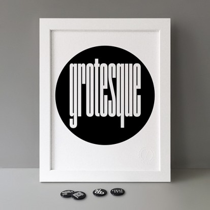 Type Classifications: Grotesque (set in Coign Pro 15 Medium), Geometric (set in Futura Bold), Modern (set in Walbaum Medium) and Slab (set in ITC Lubalin Graph Bold). This artwork is from Stereohype's B.I.O. (By Invitation Only) Button Badge Series 19.