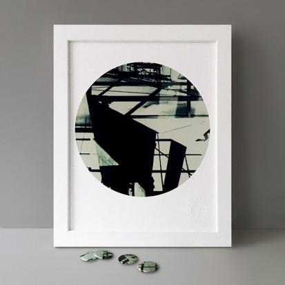 Architectonic: Inspired by an interest in abstraction, structure and surface texture. This series of imagined spaces was created by constructing and deconstructing architectural forms using analogue processes. The emphasis is on geometric shapes and intersecting diagonal lines. This artwork is from Stereohype's B.I.O. (By Invitation Only) Button Badge Series 19.