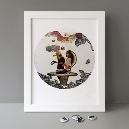 The collage "Seers" has at its centre two young girls envisioning a possible future for a devastated planet, incorporating ideas such as environmental destruction, hope in a new generation, the importance of girls and womyn (of all colour), the power of dreams and visions, death and renewal, the connection of all things, the universe and our place in it. The badges include the centre image and a few details that play on the idea of seeing: a rearview mirror, an eye-shaped assembly of half moons, the transformation of bones by luminous clouds.