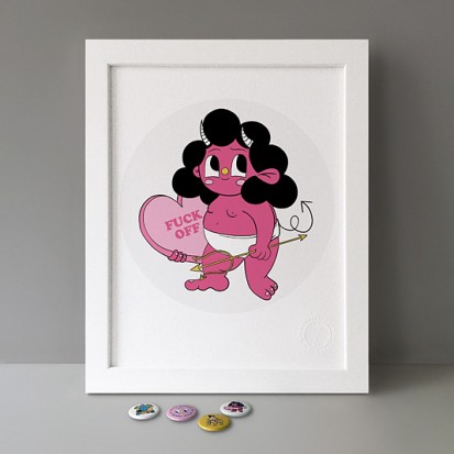 Button Badge Motif Print (STBBMP) — This carefully curated edition features designs from Stereohype's ever-growing one inch (25mm) button badge collection. The circular artworks are enlarged to seven inch (178mm) and printed on demand on a beautifully textured paper (portrait, 8 x 10" / 203 x 254mm). The print series already includes over 500 artworks and will further grow to be as rich and versatile as Stereohype's widely-acclaimed button badge collection. The badge collection already features over 1,700 artworks by over 600 established and emerging illustrators, graphic designers, typographers, photographers and artists from around the world. Some of Stereohype's button badge motifs are clearly better suited to be enlarged and featured on a print than others, but many hundreds of designs will make amazing print motifs. More prints are regularly added to this Stereohype range. Each print comes with the according button badge. We also have an optional custom frame for Button Badge Motif Prints (as seen in previews). This wooden high quality custom frame is built with a matt, white 'small alpha' frame made by our local London, Clerkenwell framer. Frames are also made on demand.