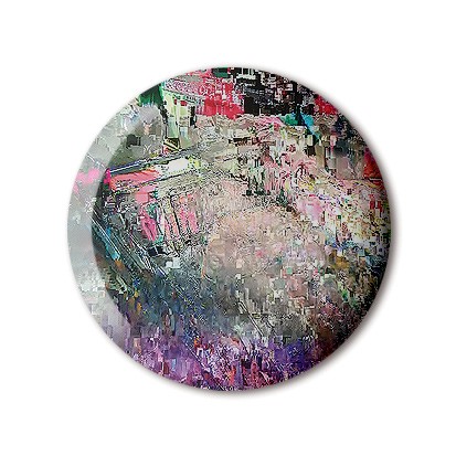 Details of glitch visuals by FL@33's Tomi Vollauschek from his collection of screenshots, photographs and digitally manipulated pictures that embrace random and often unexpected errors that technology confronts us with. Tomi's glitch artworks celebrate technology's aesthetics – inside and beyond the physical machines such as computers, hand-held touchscreen devices, film and photo cameras and in case of these glitch button badges – HD TV screens. Gradients and blurry colours are seemingly created with 'digital watercolour' – brief moments when frames per seconds meet data streaming struggles.