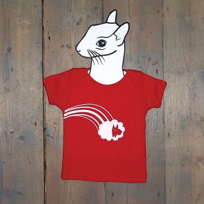 The cutest rabbit ever is sitting on a cloud watching a rainbow. Created by Agathe Jacquillat and Tomi Vollauschek of London-based design studio FL@33 the Rabbit & Rainbow motif was one of the first to be screen-printed on T-shirts for babies, young toddlers and grown-ups alike.