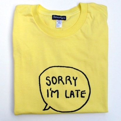Sorry I'm Late was originally designed by Richard J. Kirk for his Stereohype B.I.O. (By Invitation Only) Button Badge Series 2 contribution. One of Stereohype's most consistantly popular button badges it is really about time we made the T-shirt. The Sorry I'm Late button badge was also one of the hand-picked designs selected for themed button badge sets Stereohype manufactured for its partner Habitat (see flat33.com for more info).