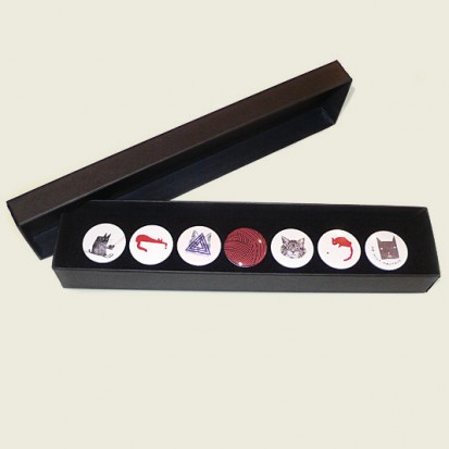 Each of these long luxury gift boxes contains seven of Stereohype's popular button badges. Selected designs are taken from Stereohype's growing button badge collection. Inside the elegant matt black cardboard gift box is a black flock pad and badges are directly pinned into it. So-called Themed Gift Boxes are curated and feature button badges designed by various creators selected from Stereohype's super-talented 600+ international contributors – artists, illustrators, designers, architects, photographers, collectives and studios. All Stereohype button badges available at stereohype.com are classic high quality one inch (25mm) metal back badges with so-called D-pin. Tiny stickers at the back of each button badge mention the artist, release date, series number, etc. Badges are printed and encapsulated with love and care in the United Kingdom.
