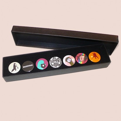 Each of these long luxury gift boxes contains seven of Stereohype's popular button badges. Selected designs are taken from Stereohype's growing button badge collection. Inside the elegant matt black cardboard gift box is a black flock pad and badges are directly pinned into it. So-called Themed Gift Boxes are curated and feature button badges designed by various creators selected from Stereohype's super-talented 600+ international contributors – artists, illustrators, designers, architects, photographers, collectives and studios. All Stereohype button badges available at stereohype.com are classic high quality one inch (25mm) metal back badges with so-called D-pin. Tiny stickers at the back of each button badge mention the artist, release date, series number, etc. Badges are printed and encapsulated with love and care in the United Kingdom.