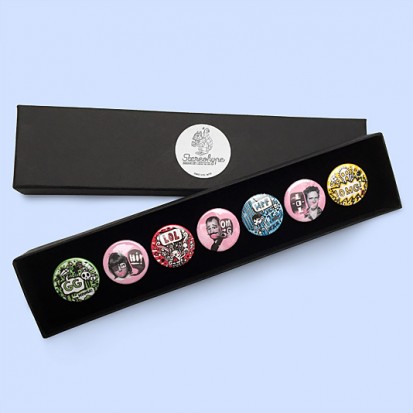 Each of these long luxury gift boxes contains seven of Stereohype's popular button badges. Selected designs are taken from Stereohype's growing button badge collection. Inside the elegant matt black cardboard gift box is a black flock pad and badges are directly pinned into it. So-called Themed Gift Boxes are curated and feature button badges designed by various creators selected from Stereohype's super-talented 600+ international contributors – artists, illustrators, designers, architects, photographers, collectives and studios. All Stereohype button badges available at stereohype.com are classic high quality one inch (25mm) metal back badges with so-called D-pin. Tiny stickers at the back of each button badge mention the artist, release date, series number, etc. Badges are printed and encapsulated with love and care in the United Kingdom.